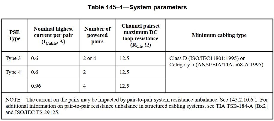 Naheliegend ist es zunächst einmal, sich die Anforderungen des IEEE selber heranzuziehen. Diese Anforderungen sind auch bei der höchsten Leistungsstufe gemäß IEEE 802.3bt eher „bescheiden“: Es werden eine Verkabelung der Klasse D und damit Komponenten der Kategorie 5 empfohlen. So gut wie keine aktuelle Installation oder Fachplanung sieht Kabel vor, die schlechter sind als Kategorie 6, fast alle Planungen schließen sogar die Nutzung von Kategorie-7- oder 7A-Kabeln ein. Also kein Problem, da IEEE natürlich keine Summation von Wärmequellen betrachtet. Nachfolgend die Tabelle 1 aus der IEEE 802.3bt: