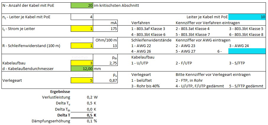 prechen. Doch zunächst: Wer oder was ist AMEV? AMEV steht für „Arbeitskreis Maschinen- und Elektrotechnik staatlicher und kommunaler Verwaltungen“ und hat eine frei abrufbare Richtlinie für die Planung von Infrastrukturen bei öffentlichen Gebäuden herausgegeben. Verantwortlich für diese Richtlinie ist das „Bundesministerium des Inneren, für Bau und Heimat“. Unter anderem betrachtet die AMEV auch die „Planung, Bau und Betrieb von räumlich begrenzten anwendungsneutralen Kommunikationsnetzwerken in öffentlichen Gebäuden“ (URL: https://www.amev-online.de/AMEVInhalt/Planen/Fernmelde-und-IT-Anlagen/LAN%202021/). Da gibt es eine Berechnungshilfe zur Kabelerwärmung in Form einer EXCEL-Datei, in welche man verschiedene Parameter eingeben und dann auf Basis der EN 50174-2 die Dämpfungserhöhung des Datenkabels in % ermitteln kann. Daraus wiederum kann man mithilfe eines vorliegenden Datenblatts beurteilen, ob die Länge des Datenkabels noch den geforderten Datendienst zulässt. Der nachfolgende Screenshot veranschaulicht die Idee der Tabelle und ist weitestgehend selbsterklärend: