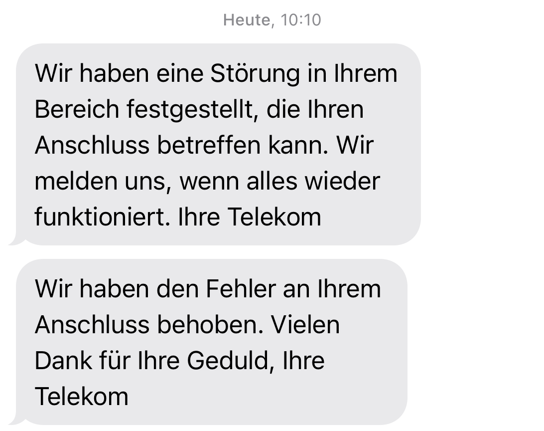 Gegen 10:00 Uhr kam per SMS eine Nachricht vom Provider, die von einem Problem in meinem Anschlussbereich berichtete. Ich war positiv überrascht. Solche Ausfälle sind eher selten, weshalb ich nicht sagen kann, wann ich zuletzt einen so langen Ausfall erlebt habe. Ich bin jedoch sicher, dass ich in früheren Fällen noch nie eine solche Nachricht per SMS bekommen habe. Technisch ist eine solche Benachrichtigung nicht trivial. Es muss beim Provider eine Datenbasis darüber geben, welche Kunden vom Ausfall eines bestimmten Gerätes bzw. Dienstes betroffen sind und über welche Kanäle sie anderweitig erreicht werden können. Und dann muss es auch noch einen organisatorischen Prozess oder einen Automatismus geben, der die Benachrichtigung anstößt. Schließlich muss der Server, der die Nachricht sendet, technisch befähigt sein, möglicherweise an viele Adressaten die Nachricht zu senden. Unter uns: In wie vielen unternehmensinternen Netzen funktioniert eine solche Benachrichtigung?