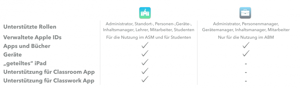 Diese Accounts werden auch als verwaltete Apple ID bezeichnet. Im Gegensatz zu einer „normalen“ Apple-ID gehört eine so erzeugte ID nicht dem Anwender selbst, sondern dem Unternehmen. Auch der Funktionsumfang der Apple-ID ist beschränkt und hauptsächlich auf die Arbeit im ABM zugeschnitten. Für die angelegten verwalteten Apple-IDs bietet der ABM verschiedene Funktionen (Rollen) an.
