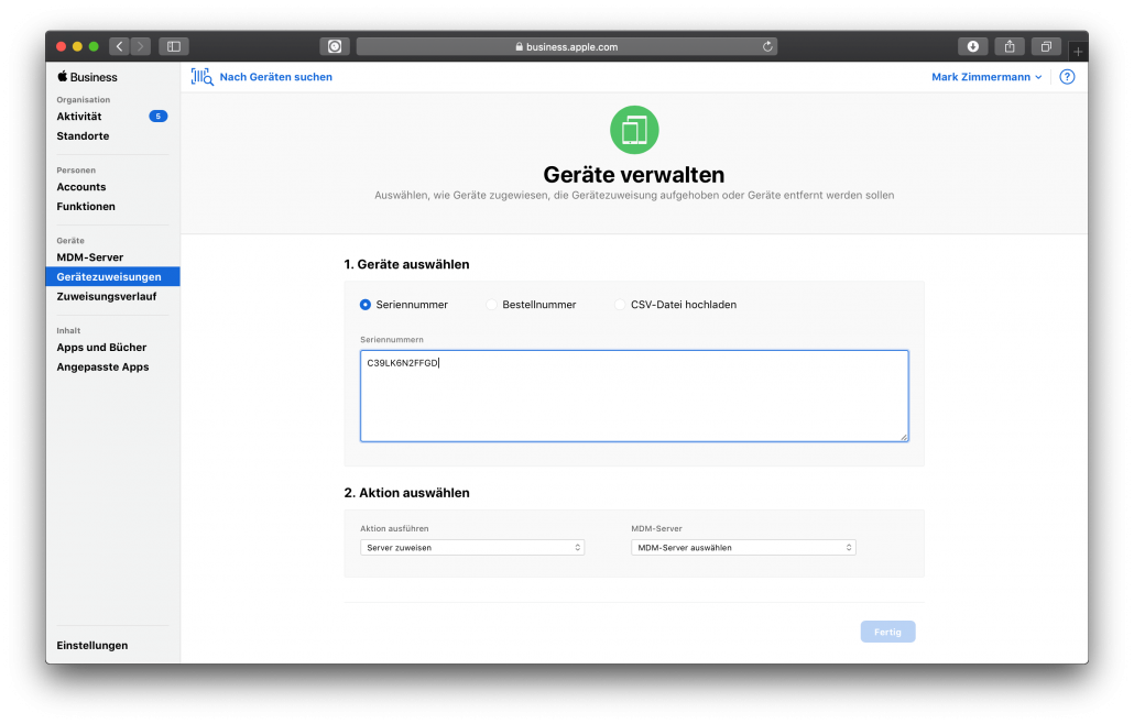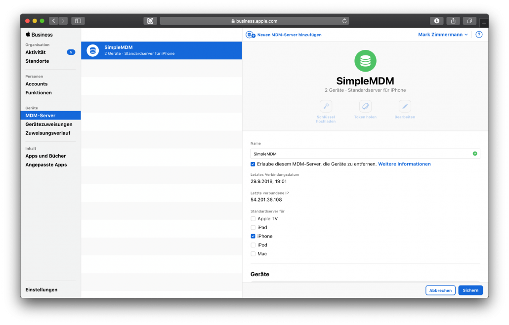 Administratoren und Gerätemanager können mithilfe des ABM bestellte Geräte direkt einem MDM-System eines Unternehmens zuordnen. Dadurch können diese Geräte bereits konfiguriert werden, noch bevor diese ausgepackt wurden. Diese Funktion wurde früher durch das DEP (Device Enrollement Program) Portal abgebildet und steht nun als Funktion im ABM zur Verfügung.