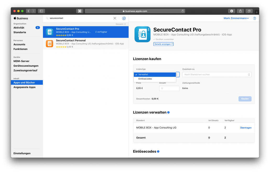 Zu beachten ist allerdings, dass bei diesen beiden Arten der Verteilung auch lizenzrechtliche Unterschiede bestehen. Nur bei der verwalteten Verteilung via MDM bleiben die Eigentumsrechte an dem Inhalt bei dem jeweiligen Unternehmen. Mit der Verteilung von Einlösecodes werden die Eigentumsrechte an den Anwender übertragen und können nicht widerrufen werden. Die Einlösecodes werden dauerhaft mit der Apple-ID verknüpft, mit der sie durch den Anwender eingelöst wurden. Durch die Übertragung der Eigentumsrechte sind diese Inhalte dann auch z.B. in der Familienfreigabe des Anwenders für Familienangehörige verfügbar.