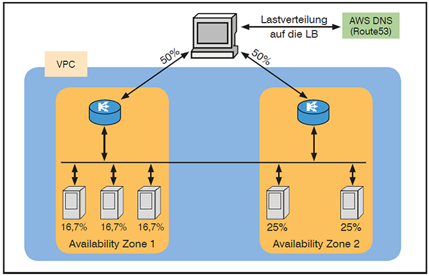 Hat man dieses Feature nicht aktiviert, so kommt es zu einer anderen Verteilung, wie exemplarisch in Abbildung 5 gezeigt: beide Load Balancer bekommen 50% der Anfragen. Da diese jedoch in der Availability Zone gehalten worden, bekommt jede Instanz von Zone 1 rund 16,7% des gesamten Verkehrs, wohingegen die Instanzen in Zone 2 jeweils 25% von allem verarbeiten müssen.