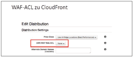 Anders als Load Balancer oder CloudFront ist die WAF keine Instanz, sondern ist ein Regelwerk. Das heißt, anders als der Name vermuten lässt, ist es keine Firewall, der man eine IP Adresse zuweisen muss und die man zwischen Internet und Load Balancer / CloudFront positioniert. Vielmehr wird das Regelwerk direkt an den Dienst gebunden. Abbildung 8 zeigt wie eine WAF-ACL einer CloudFront Distribution zugeordnet wird.