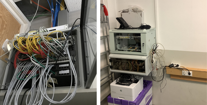 Bedingt durch die grundsätzlich vorhandene Minimal-IT-Infrastruktur gibt es bereits IT-Verteiler, die selten als eigene Räume ausgebildet sind, woher soll der Platz dafür auch kommen, sondern eher als 19“-Stand- oder Wandverteiler. Diese Schränke sind in der Regel zu klein ausgelegt, um eine zusätzliche Neuverkabelung aufzunehmen, schlecht oder gar nicht dokumentiert und sehr unordentlich mit Anschlussschnüren verkabelt.