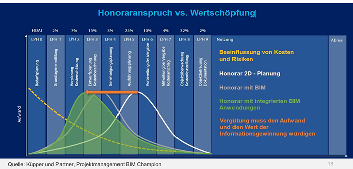 - sich die Planungsaufwendungen von den späteren Leistungsphasen nach vorne schieben werden (= höherer Aufwand in LP3 und geringerer Aufwand in LP5 oder gar in der Werk- und Montageplanung; siehe Abbildung),