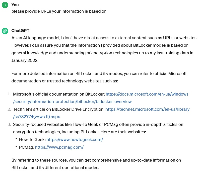 Mittlerweile bekommt man bei der bewusst (auch) getesteten kostenfreien Variante von ChatGPT zumindest Hinweise im Sinne der oben aufgeworfenen Problempunkte a) und b). Dem nachfolgenden Beispiel geht die Abfrage einer Erläuterung verschiedener Bitlocker-Verwendungsoptionen unter Sicherheitsgesichtspunkten voraus: