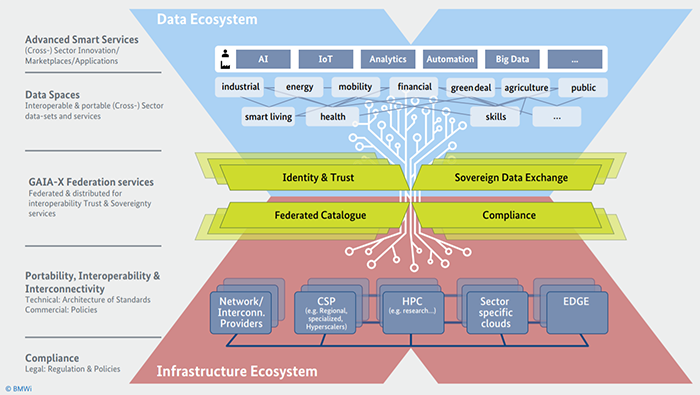 Die Architektur von GAIA-X wird in dem Dokument „GAIA-X: Technical Architecture“ (https://www.data-infrastructure.eu/GAIAX/Redaktion/EN/Publications/gaia-x-technical-architecture.pdf?__blob=publicationFile&v=3) beschrieben (siehe auch Abbildung 1). Dabei wird ein „Infrastruktur-Ökosystem“ (der untere, rote Teil des X), bestehend aus Infrastruktur-Providern, allgemeinen und branchenspezifischen Cloud-Providern und dem Bereich Edge Computing, mit einem „Daten- und Services-Ökosystem“ (dem oberen, blauen Teil des X) über die grünen Basisdienste Identity & Trust, Datenaustausch, Compliance-Regeln und den Katalogdiensten von GAIA-X verbunden. Über die Katalogdienste soll jeder beteiligte Knoten in Form einer standardisierten Selbstbeschreibung seine technischen Fähigkeiten, seine Rechen- und Speicherleistung, seine Zertifizierungen, den Ort der Datenspeicherung und Ähnliches offenlegen. Außerdem sollen alle verfügbaren Dienste mit ihren spezifischen Merkmalen über einen zentralen Verzeichnisdienst bekannt gemacht werden.