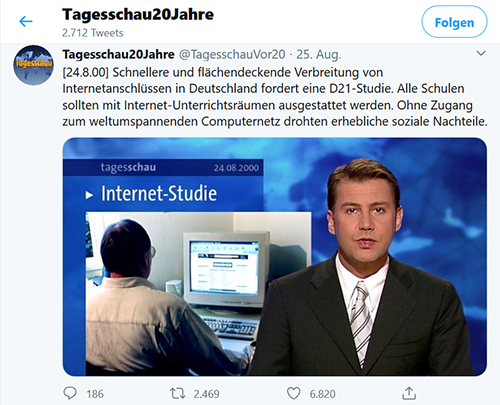 Und das Thema ist nicht neu. Wie man am folgenden Bild erkennen kann, ist nicht nur Jens Riwa seit über 20 Jahren Sprecher der Tagesschau, sondern auch an dem Thema „Digitalisierung von Schulen“ wird seit mehr als zwei Jahrzehnten herumgebastelt.