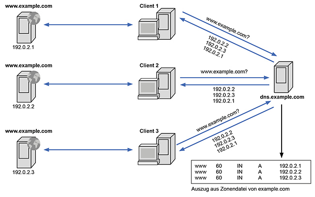 - Der DNS-Dienst selbst kann wiederum so konfiguriert werden, dass er die Funktion der Load Balancer überwacht. Bei einem Ausfall wird nur noch die IP-Adresse des weiterhin aktiven Load-Balancers an die Clients weitergeleitet.