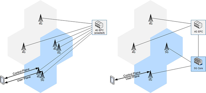 Abbildung 1: 5G Non-Standalone (links) und 5G Standalone (rechts) [1]