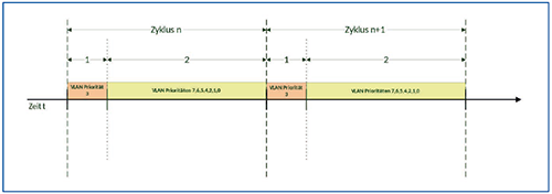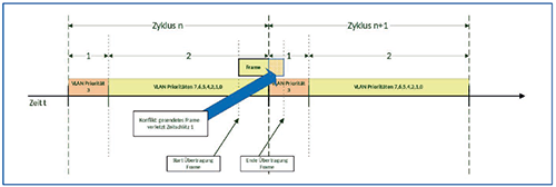 Length-Aware Scheduling besagt, dass der Switch prognostiziert, ob das zu sendende Frame eine Verletzung des fixen Zeitfensters verursachen würde. Falls ja, greift das volle Schutzband. Wenn nein, wird das Frame gesendet und das Schutzband entsprechend eingekürzt. Voraussetzung ist jedoch, dass der Switch die Größe des Frames vorab kennt, also im Modus Store and Forward operiert und nicht im schnelleren Cut-Through Modus.