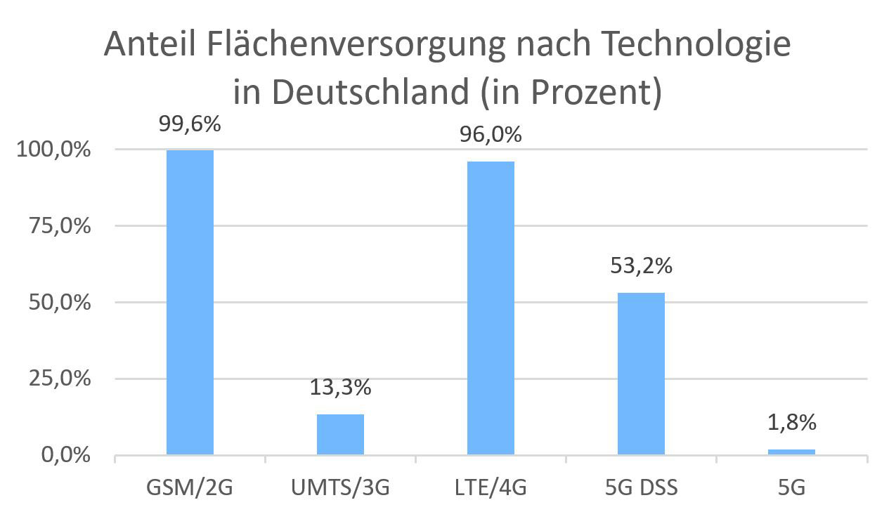 So wurde Ende Oktober 2021 eine flächendeckende Mobilfunkversorgung, aufgeteilt über alle Provider, gemäß Abbildung 2 erreicht. Hierbei gilt zu betonen, dass es sich um die Fläche Deutschlands handelt und nicht pro Haushalt, wie in der Versorgungsauflage gefordert wird.