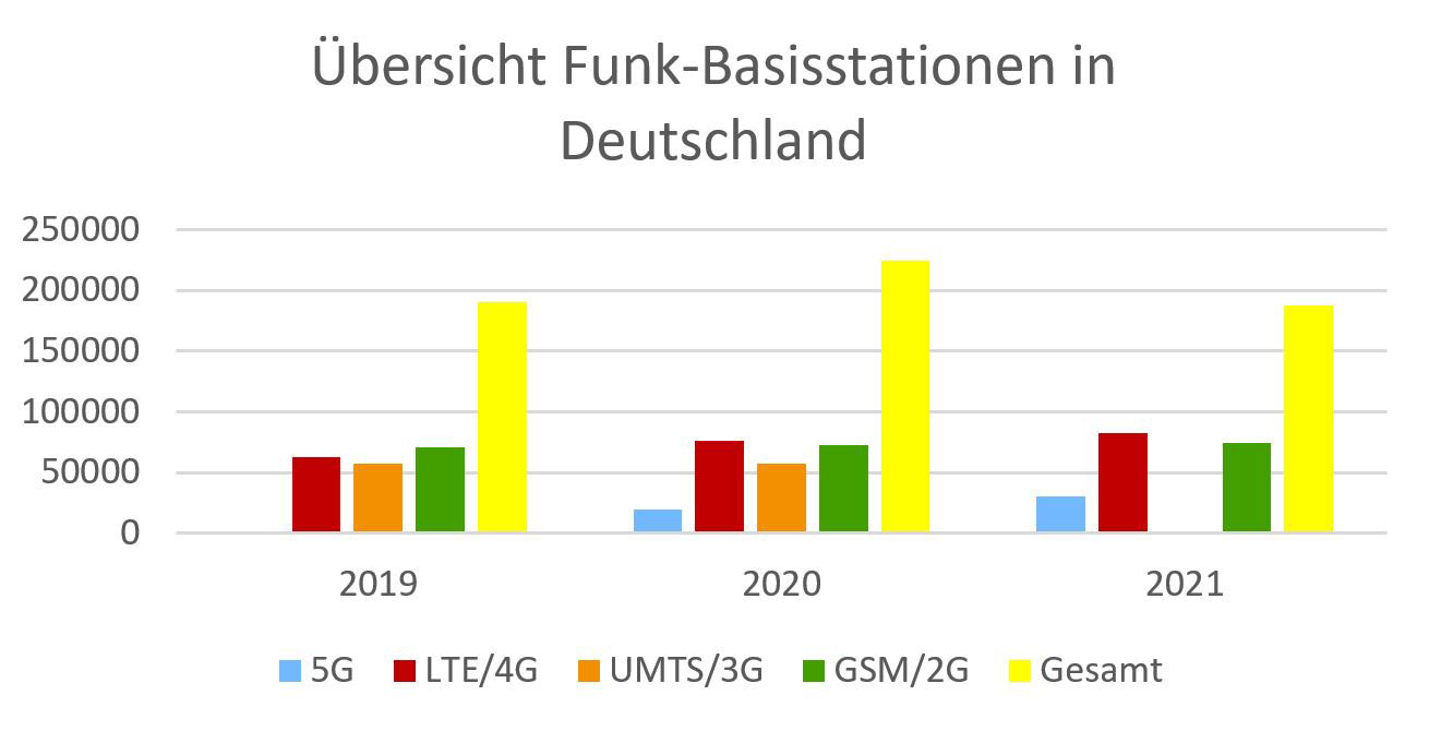Die Funk-Basisstationen spielen einen wichtigen Part beim Ausbau der Mobilfunknetze. Das 3G-Netz wurde 2021 abgeschaltet, wohingegen sich der 2G-Standard immer noch vollständig am Netz befindet. Den größten Zuwachs verzeichnen die 5G-Basisstationen, wie aus folgendem Diagramm ersichtlich wird: