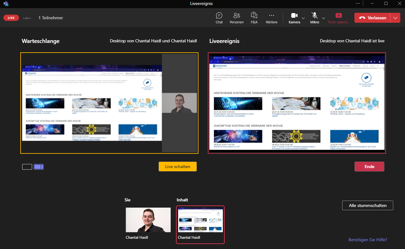Ein Vorteil der Liveereignisse ist der allgemeine Ablauf. Es ist automatisch eine Art Warteraum aktiviert, in dem man sich vorab noch kurz absprechen kann. Erst wenn livegeschaltet wird, sind von allen Personen im internen Bereich verbale Äußerungen zu hören und geteilte Quellen zu sehen. Nach Beendigung des Liveereignisses gelangt man wieder in den Warteraum zurück, und man kann alles noch mal Revue passieren lassen, ohne dass ein Teilnehmer das mitbekommt. Die Ansicht selbst verändert sich bei dem Vorgang nicht, der Warteraum ist eher metaphorisch zu verstehen.