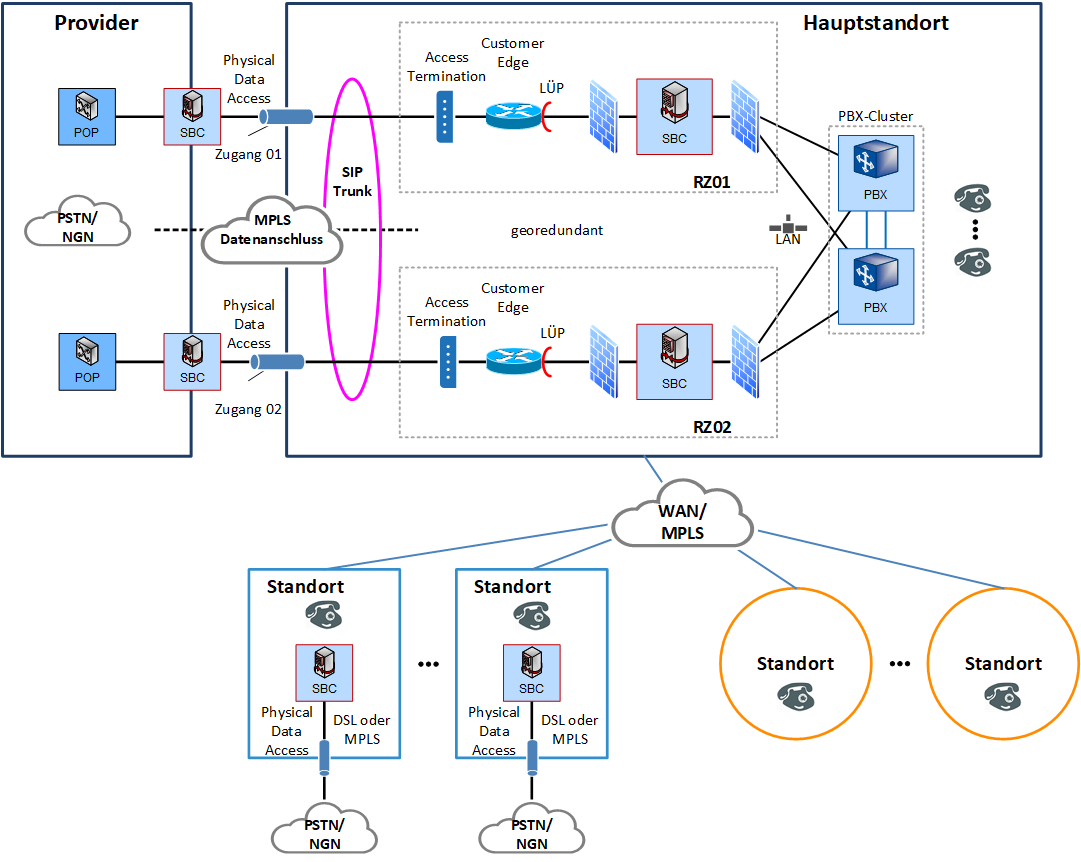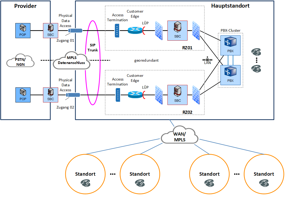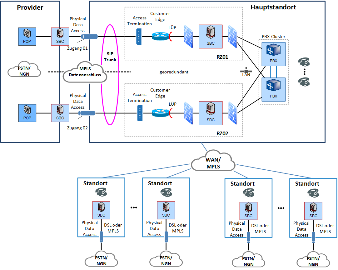 Für die SIP-Anbindung können neben einem zentralen SIP-Trunk noch weitere, dezentrale SIP-Trunks genutzt werden (siehe Abbildung 6).