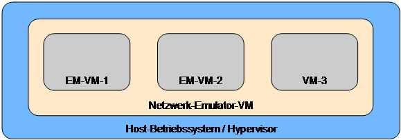 Nahezu alle verbreiteten Lösungen setzen Virtualisierung zur Emulation der Netzwerkkomponenten ein. Hierbei unterscheiden sich zwar die eingesetzten Virtualisierungsmethoden, das Grundprinzip ist jedoch meist gleich und vergleichsweise einfach: Der Emulations-Host bietet die Grundfunktionen zur Vernetzung auf ihm gehosteter virtueller Maschinen. Zusätzlich werden Schnittstellen zur Einrichtung der Verbindungen und Netze wie beispielsweise eine Web-GUI verfügbar gemacht. Der Emulations-Host wird in vielen Fällen selber als virtuelle Maschine bereitgestellt, sodass die emulierten Endgeräte geschachtelt als VM in der VM betrieben werden (Nested Virtualization). Abbildung 1 zeigt hierzu den Grundaufbau mit insgesamt drei emulierten Komponenten, EM-VM-1 bis EM-VM-3, welche als virtuelle Maschinen in der Emulator-VM zur Verfügung gestellt werden. Diese wiederrum ist ebenfalls (meist) eine virtuelle Maschine. Hierdurch können alle bekannten Vorteile einer VM-Bereitstellung genutzt werden. Der Emulator ist skalierbar, portabel und kann sehr einfach in bestehende Virtualisierungsumgebungen integriert werden.