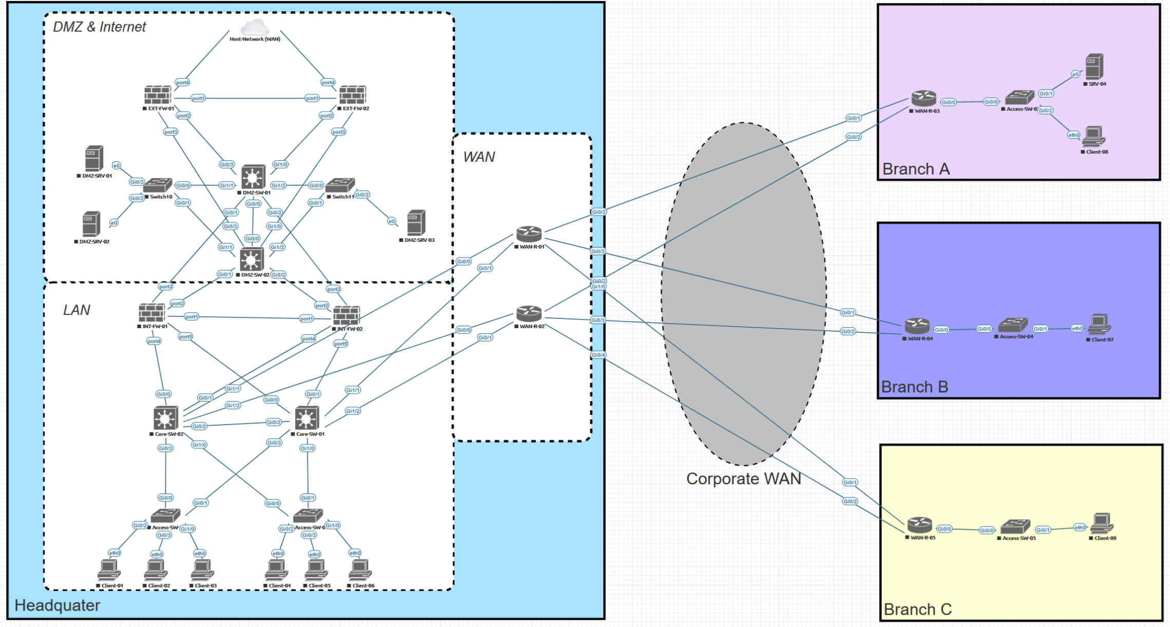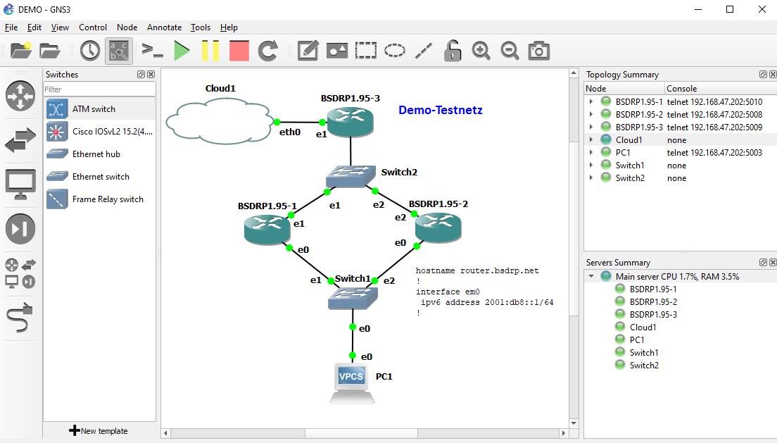 Abbildung 7: Beispiel für ein emuliertes Campus-Netz in EVE-NG