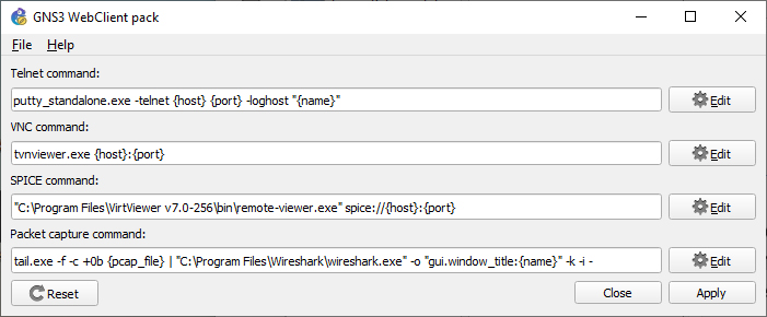 Abbildung 5: Konfiguration von telnet, VNC, Spice und Wireshark im GNS3 WebClient pack