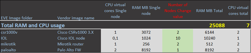 Hinsichtlich der Systemvoraussetzungen gilt Ähnliches wie bei GNS3 oder CML. Je mehr Komponenten bzw. je mehr Komponenten unterschiedlicher Art gleichzeitig emuliert werden sollen, umso höher ist der Speicherbedarf. Als Hilfestellung für die Abschätzung des Ressourcen-Bedarfs bietet der Hersteller eine Excel-Tabelle: