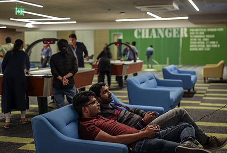 Abbildung 2: Bürofläche von Amazon in Indien. Offizielles Motto: „work hard. have fun. make history.“ Quelle: Bloomberg