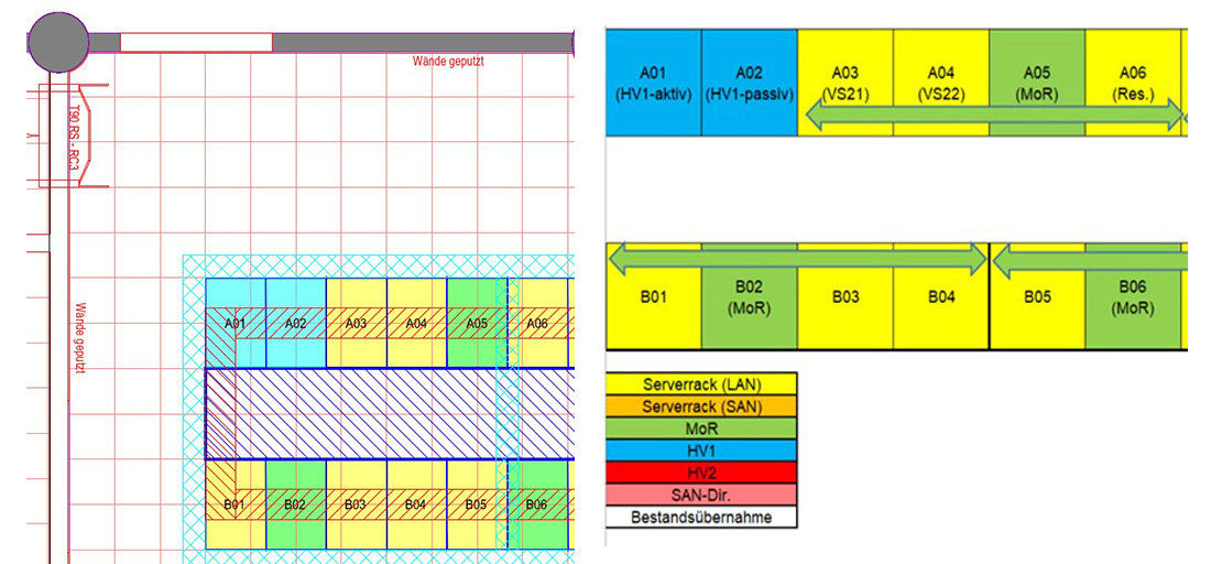 Selbstverständlich wurden alle Racks – inklusive der Kabelführungssysteme – in Form eines „Floor Layout“ und die 19“-Bestückung in Form eines „Rack Layout“ im Grundriss dokumentiert. Das Floor Layout liegt im Idealfall maßstabsgerecht in CAD-Form vor, ein einfaches Schema wird für den Umzug aber auch ausreichen. Insbesondere die schematische Darstellung gibt die Möglichkeit, die wichtigsten Rack-Typen farblich zu kennzeichnen und Versorgungsbereiche von Bereichsverteilern hervorzuheben (im Bild unten: Middle-of-Row-Racks). Eine solche Information schnell ablesen zu können, kann beim Umzug hilfreich sein. (siehe Abbildung 1)