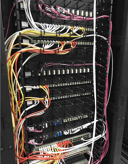Die Server- und Netzracks wurden mit einer ausreichenden Kommunikationsverkabelung ausgestattet, deren Ziel die Vermeidung einer schrank- oder gar reihenübergreifenden Verkabelung mit Patchkabeln ist. Die Erfahrung zeigt, dass eine 100%-ige Vermeidung nie möglich ist und man immer mit Patchkabeln rechnen muss, die aus einem Rack herauszuführen sind.