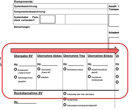 Der Systemverantwortliche (SV) hakt ab, wenn das System stromlos ist und demontiert werden darf. Danach übernimmt eine weitere Umzugseinheit die Entkabelung der Strom- und Datenanschlüsse. Dies schafft die Voraussetzung dafür, dass das Umzugsunternehmen übernehmen und transportieren kann. Am Zielort wird die Ankunft bestätigt und an die einbauenden Monteure übergeben usw. (siehe Abbildung 5)