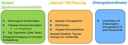 Gerade das Zusammenstellen der Daten von vielen Systemverantwortlichen und Nutzern dauert erfahrungsgemäß sehr lange und kann bei fehlender hartnäckiger Nachfrage durch die RZ-Planung zu einer Gefährdung des Umzugstermins führen.