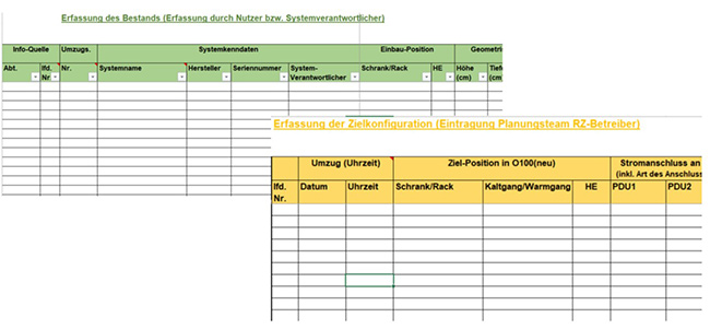 Die Nutzer der Systeme (Server, Storage, Tape etc.), also die Systemverantwortlichen, erfassen in erster Linie die Ist-Kenndaten. Teilweise können bereits Wunschtermine zum Umzug und auch Zielpositionen im neuen RZ genannt werden. Es zeigt sich, dass die Erfassung der Ist-Kenndaten sehr zeitaufwendig ist und hiermit frühzeitig begonnen werden muss.