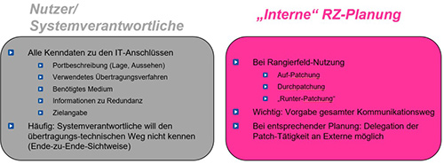 Für wen sind die Patchlisten wichtig? Da sind die Systemverantwortlichen, die festlegen müssen, bei welchem System welcher LAN-Port zu benutzen ist und mit welchem „Gegenstück“ dieser zu verbinden ist. Dabei spielt es aus Sicht der Systemverantwortlichen zunächst keine Rolle, über welche Patchpanel die Verbindung aufzubauen ist, er denkt in „Ende-zu-Ende-Beziehungen“. Die übergreifende Umzugsplanung (= „interne“ RZ-Planung) muss dagegen das Wissen besitzen, wie die Festverkabelung zwischen den verschiedenen Racks aussieht, auf welchem Rangierfeld welche Ports genutzt werden können, welche Leistungsfähigkeit ein Port hat etc. Damit zeichnen sich zwei Zuständigkeitsblöcke ab (siehe Abbildung 8):