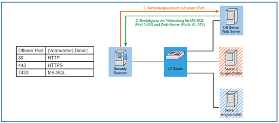 Port-Scan: Alle erreichbaren Systeme werden darauf überprüft, welche Dienste sie anbieten. Dabei ist ein Dienst in der Regel mit jeweils mindestens einem Netzwerk-Port (TCP oder UDP) gleichbedeutend. Ein Schwachstellen-Scanner überprüft eine Liste von vorgegebenen Ports auf Erreichbarkeit und trifft Annahmen zu den darüber erreichbaren Diensten (siehe Abbildung 5). Dabei sind sowohl die Portlisten als auch die Korrelation zu üblichen Diensten variabel und wirken sich stark auf die Dauer eines Port-Scans aber auch auf die Dauer des eigentlichen Schwachstellen-Scans aus.