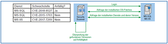 Agenten-basierter Scan und Scan mit Login-Daten: Als Alternative oder als Ergänzung eines klassischen Black-Box-Scan über das Netz können auch Agenten auf dem Zielsystem oder Login-Daten für das jeweilige Ziel eingesetzt werden. Diese sammeln die Daten direkt auf dem Zielsystem und melden diese an den zentralen Schwachstellen-Scanner. Dabei werden hauptsächlich die Versionen der installierten Software mit einer Liste von bekannten Schwachstellen abgeglichen. Diese Art der Überprüfung ist normalerweise schneller als ein Scan von außen. Das Beispiel per Login ist in Abbildung 7 dargestellt. Der Vorteil hier ist, dass nicht nur von außen erreichbare Dienste, sondern auch interne Abhängigkeiten auf Sicherheitslücken überprüft werden. Dies ermöglicht, auch mögliche indirekte Angriffe auf weitere Software besser zu erkennen. Ein solcher Scan per Login ist in vielen Fällen auch auf Netzwerkkomponenten und Appliances möglich, ein Einsatz von Agenten ist im Allgemeinen nur auf Servern und/oder Endgeräten möglich, sofern der Hersteller des Schwachstellen-Scanners für das jeweilige Betriebssystem einen Agenten anbietet.
