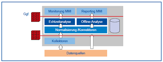 Die allgemeine Architektur eines SIEM-Systems zeigt die Abbildung 8. Es ist deutlich, dass es eine sichtbare Ähnlichkeit zu LM-Lösungen gibt, jedoch ist z.B. die Normalisierung unterschiedlicher Quellen eine entscheidende Eigenschaft.