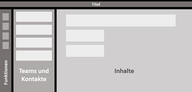 Abbildung 1: Grundsätzlicher Aufbau aller Desktop-Clients von UCC-Anwendungen: Teams (und Kontakte) können aus einer Liste ausgewählt werden. Die dazugehörigen Inhalte werden in dem großen zentralen Bereich dargestellt. Am linken Rand kann häufig eine bestimmte Anwendung ausgewählt werden, zum Beispiel die Telefonie oder ein Kalender mit Besprechungen.