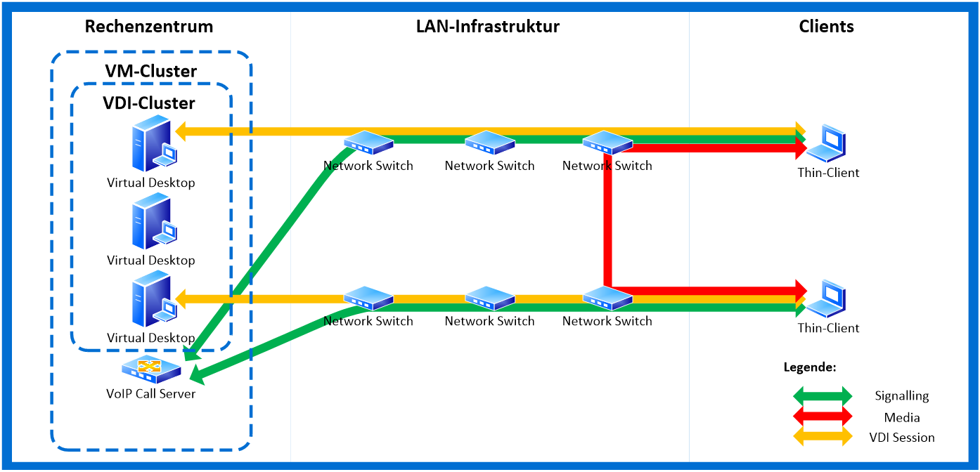 Die virtualisierte Bereitstellung von Applikationen oder gar einem gesamten Desktop ist auch heute noch weit verbreitet. Einerseits werden vielfach spezielle Thin Clients eingesetzt, die lediglich zur Betrachtung der Inhalte dienen. Andererseits werden auch klassische Windows-basierte PCs und Laptops genutzt, die über entsprechende Anwendungen einen Zugriff auf die virtualisierten Applikationen ermöglichen. Eine Bereitstellung von UC-Diensten über eine VDI-Infrastruktur steht zum Teil im Widerspruch zu den von gängigen VDI-Lösungen eingesetzten Protokollen. Zwar gibt es hier vielfach Ergänzungen, die die Verarbeitung von Audio- und Videodatenströmen aus der virtuellen Infrastruktur herauslösen und lokal auf dem Client erlauben. Ebenso kann ein UC-Client auch lokal auf dem genutzten Client ausgeführt werden. Beides stellt jedoch für Thin Clients, die aufgrund fehlender Ressourcen dazu nicht in der Lage sind, eine besondere Herausforderung dar. Als Lösung bleibt hier vielfach lediglich die Nutzung von Tischtelefonen, die über virtualisierte UC-Clients gesteuert werden können.