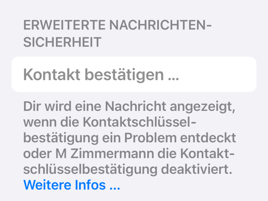 Die neueste Funktion, die Kontakt-Schlüssel-Verifizierung, zielt darauf ab, die Authentizität der Kommunikationspartner in iMessage zu stärken und das Risiko von Spoofing und Man-in-the-Middle-Angriffen zu reduzieren. Der neue Prozess der Schlüsselüberprüfung beinhaltet die Generierung eines auf Benutzerebene erstellten ECDSA-Signaturschlüssels, der auf dem Gerät des Benutzers erzeugt und im iCloud-Schlüsselbund gespeichert wird. Durch diese Maßnahme wird sichergestellt, dass nur verifizierte Kontakte zu verschlüsselten Chats zugelassen werden, wodurch das Risiko eines unbefugten Zugriffs deutlich reduziert wird. Die Einführung der iMessage-Kontaktschlüssel-Verifizierung ist somit ein entscheidender Schritt zur Erhöhung der Sicherheit und des Datenschutzes in der digitalen Kommunikation. Diese Funktion stellt sicher, dass die Nutzer mit den richtigen Personen kommunizieren, und schützt effektiv vor Identitätsdiebstahl und anderen Cyber-Bedrohungen. Damit setzt Apple erneut einen Standard in der sicheren Nachrichtenkommunikation und zeigt, dass Sicherheit und Benutzerfreundlichkeit Hand in Hand gehen können (siehe Abbildung 5).