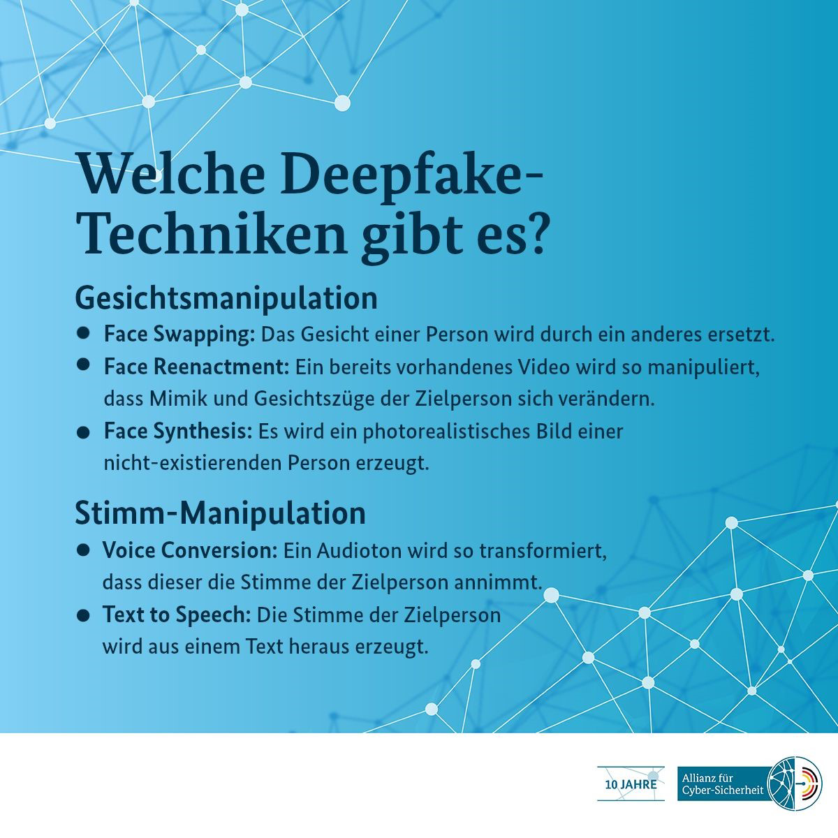 Häufig werden solche und ähnliche Techniken für die Synthese oder den Austausch von Audio- und Bilddaten auch als Deepfakes bezeichnet. Erst kürzlich hat das BSI wieder auf die Gefahren von Angriffen mit solchen Methoden hingewiesen (siehe Abbildung).