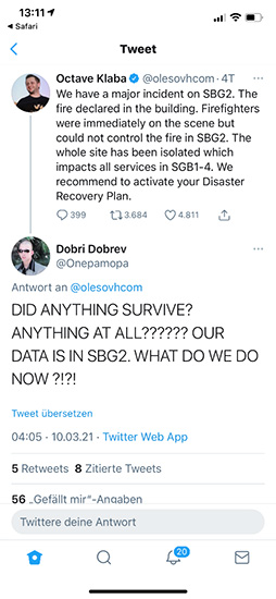 Übrigens – als Ursache vermutet man im Moment einen USV-Brand, laut Aussage von Octave Klaba auf Twitter. Das Erstaunliche hierbei ist, dass die USV am Tag zuvor gewartet worden sein soll!